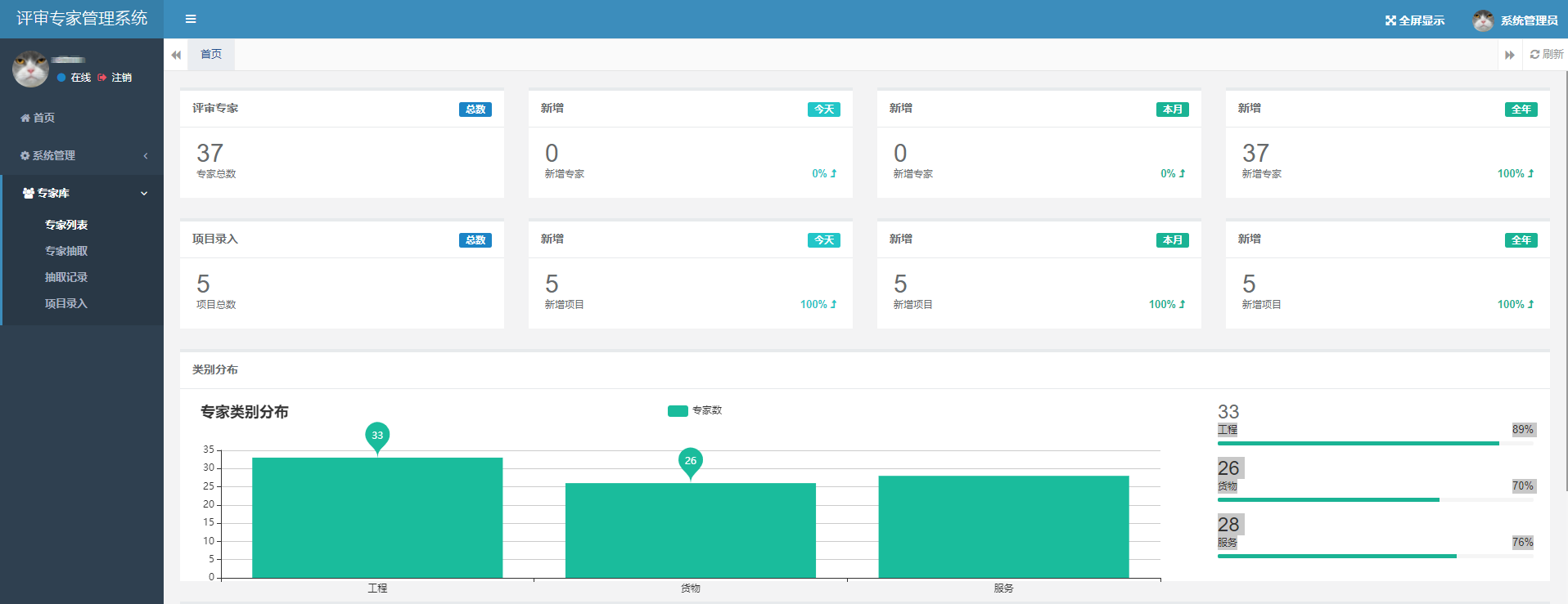6、數據統計:項目數量統計、專(zhuān)家抽取次數統計(按專(zhuān)家類(lèi)別、區域、內外分別統計)。