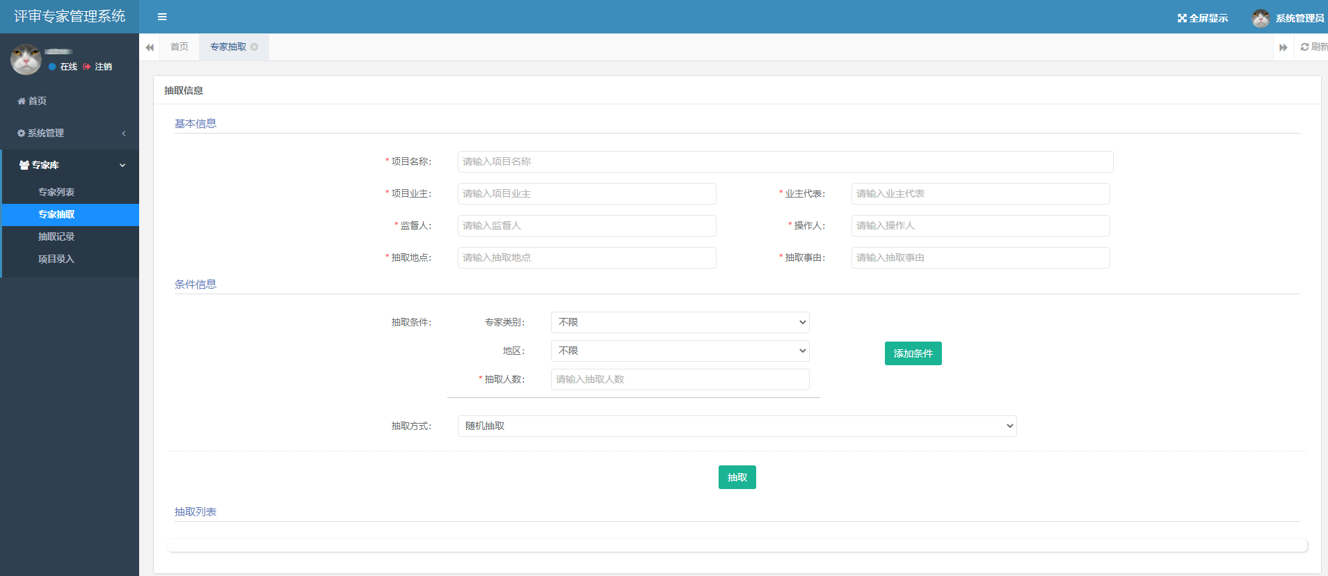 3、評審專(zhuān)家抽?。焊鶕A設規則進(jìn)行抽取、可多次抽取、抽取結束形成記錄、可打?。ɑ蛳螺d)抽取結果(抽取規則:指定專(zhuān)家類(lèi)型、地區、內外部、及各自數量)。